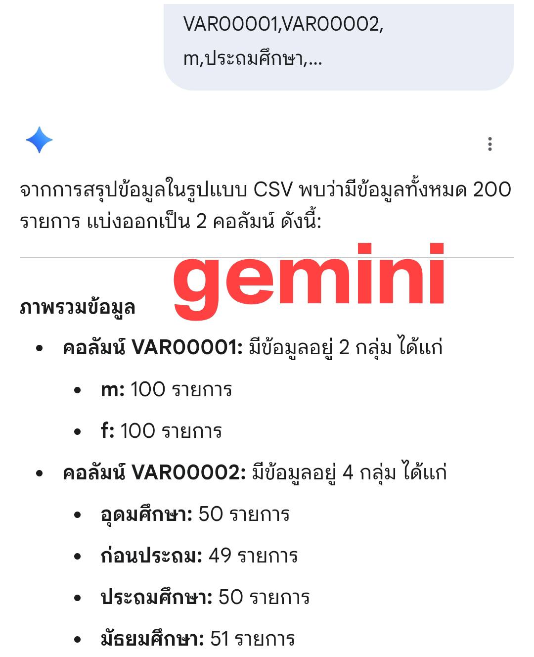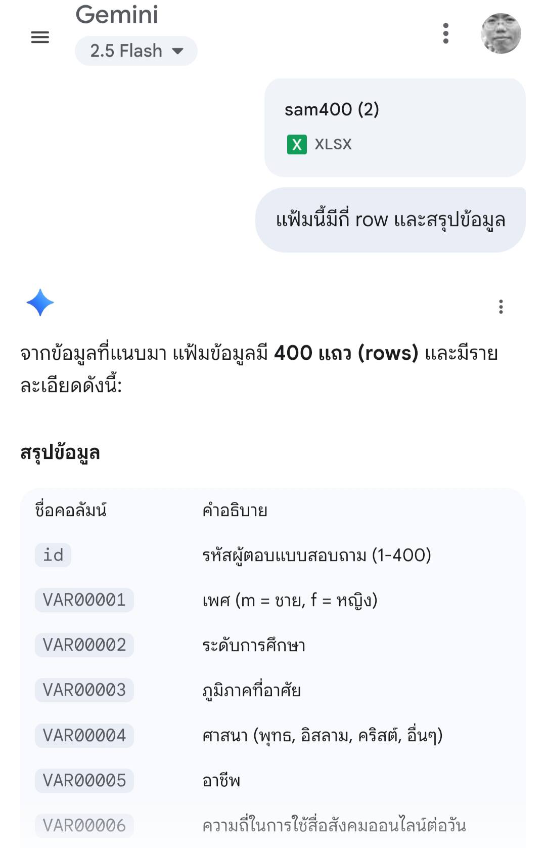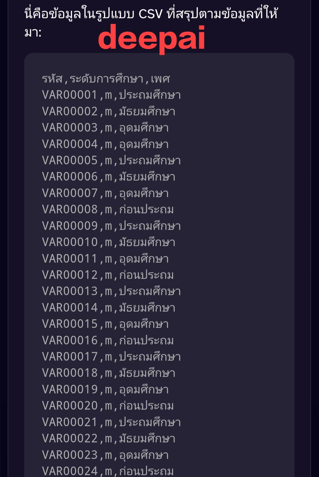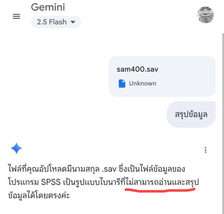 แฟ้ม .sav หรืออื่น ๆ ที่ เอไอ ยังไม่รองรับ อไอ มีความสามารถในการ generate ข้อมูลมาให้เราอย่างเหลือล้น แล้วพบว่า เราสามารถอัพโหลดข้อมูล เพื่อประกอบการประมวลผลไปร้วมกับ prompt ในหลายรูปแบบ แต่บางรูปแบบ เช่น .sav ซึ่งมีลักษณะเฉพาะที่ไม่มี library ของบริษัทผู้พัฒนา ((spss)) สนับสนุนในเอไอ ส่วนรูปแบบ .csv นั้น เอไอสามารถเข้าใจได้ ทั้งแบบแนบต่อท้ายโพสต์ไปกับเนื้อหาใน prompt หรือ upload file แต่มีข้อจำกัดเรื่องจำนวนรายการ เช่น 400 รายการ (taro yamane) พบว่า เอไอที่ได้ทดสอบ 5 ตัว ไม่มีตัวใด สามารถประมวลผลได้อย่างมีประสิทธิผล