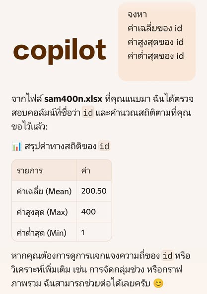 การประมวลผลข้อมูลจากแฟ้ม excel ารประมวลผลข้อมูลจากแฟ้ม excel พบว่า เอไอ หลายตัว รับแฟ้ม xlsx ได้ แล้วประมวลผลข้อมูลใน sheet ได้อย่างถูกต้อง จึงสร้างตัวอย่างข้อมูล 400 (sam400) รายการ แล้วส่งให้ A.I. ประมวลผล ได้แก่ chatgpt, perplexity, gemini, you, copilot ได้ผลดังในภาพ